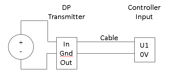 A differential pressure transmitter is powered by 24Vdc, providing an output of 0-10Vdc for a range of 0-4Bar. The sensor is connected through a run of cable 400 meters long, with a resistance of 30.5 Ω/km, to an input on a controller with an input impedance of 5kΩ. To start let me draw out the circuit: